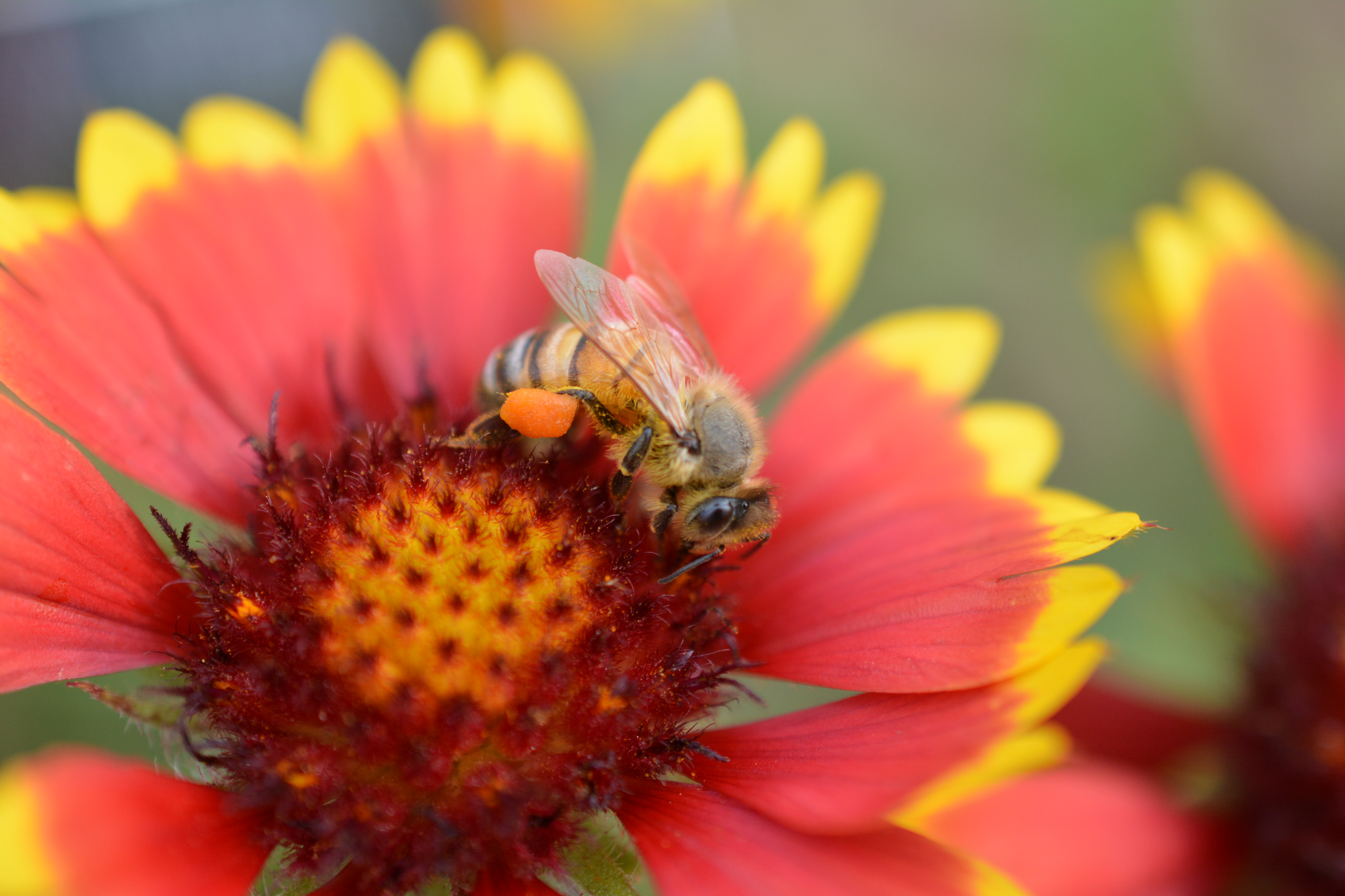 The green sweat bee was very active on many of the flowers in the garden but in particular frequented the gaillardia, aka blanket flower. This flower is a member of the sunflower family and native to North and South America. Honey bees, bumblebees and a variety of sweat bees enjoyed the sweet rewards of this showy blossom.