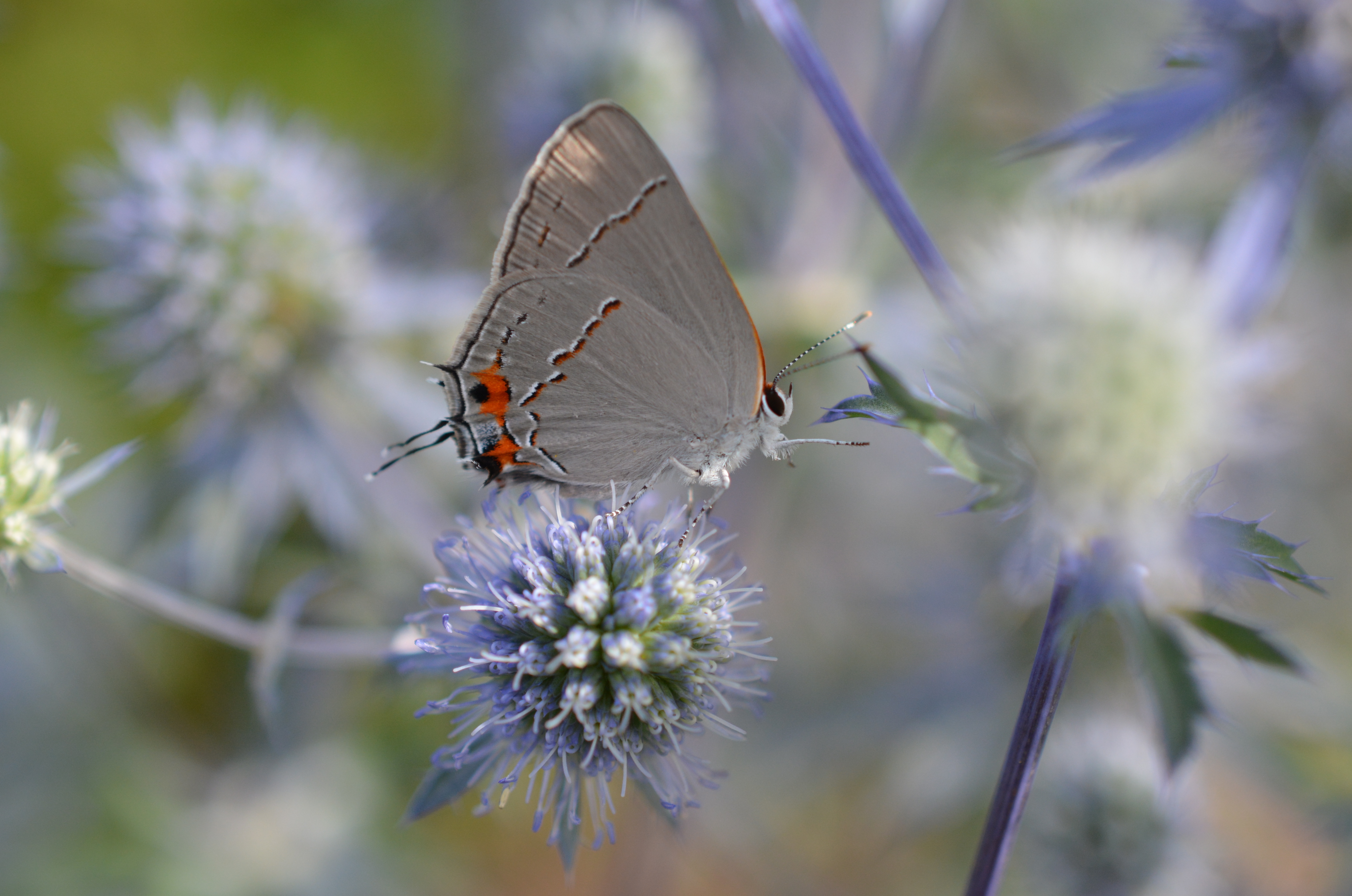 Butterflies also enjoy the sea holly flowers especially the gray hairstreak which a common but beautiful butterfly.