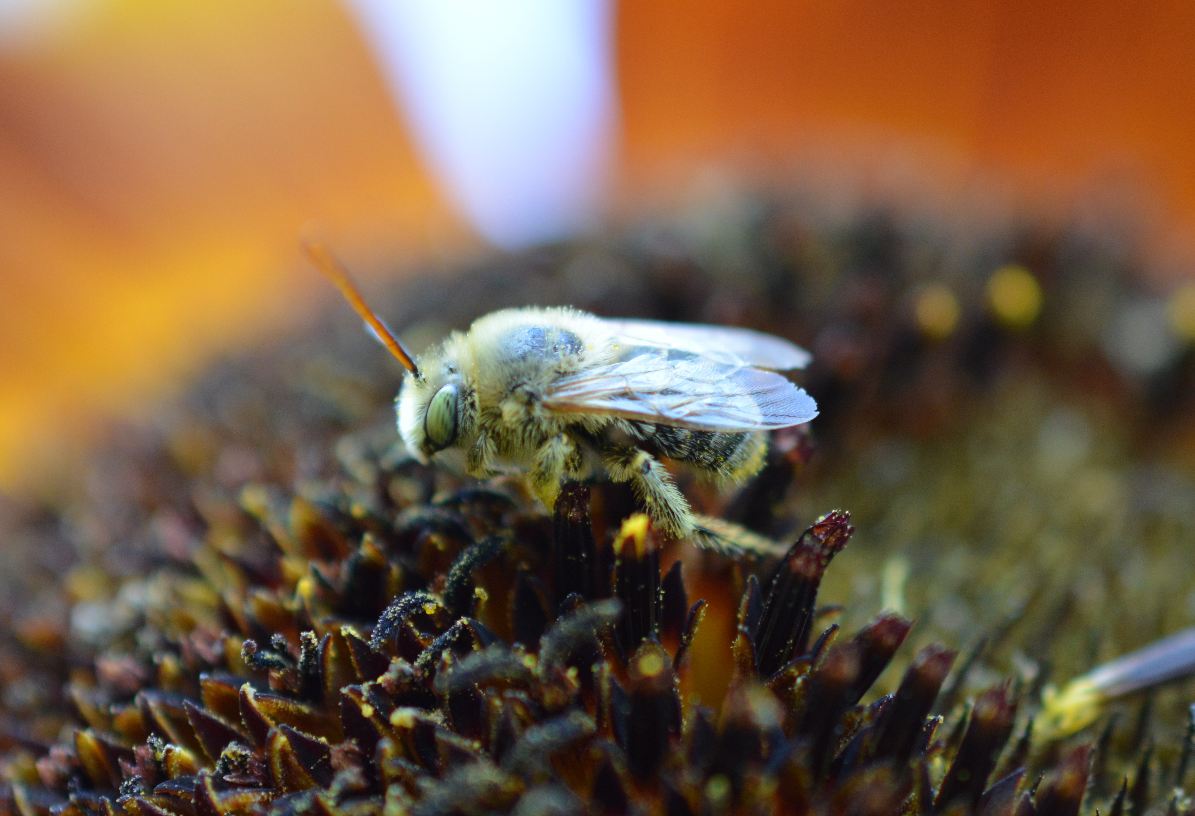 A sunflower is a composite flower composed of hundreds of tiny flowers that make a banquet feast to pollinators. Each little flower becomes a seed. Bumblebees are frequent visitors to sunflowers but keep a look out for a stocky and hairy mid-sized bee called a long-horned bee (Melissodes spp.). Why long horn? The males have very long antennae compared to the shorter antennae of the females. The males lounge around on the sunflower while the female is rapidly moving around collecting pollen on the shaggy scopae hairs that cover the lower half of her rear legs.