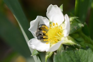 Osmia spp. pollinating a strawberry flower