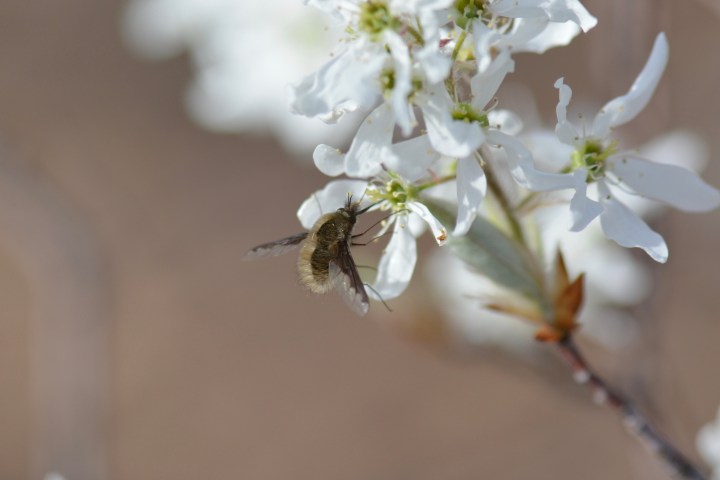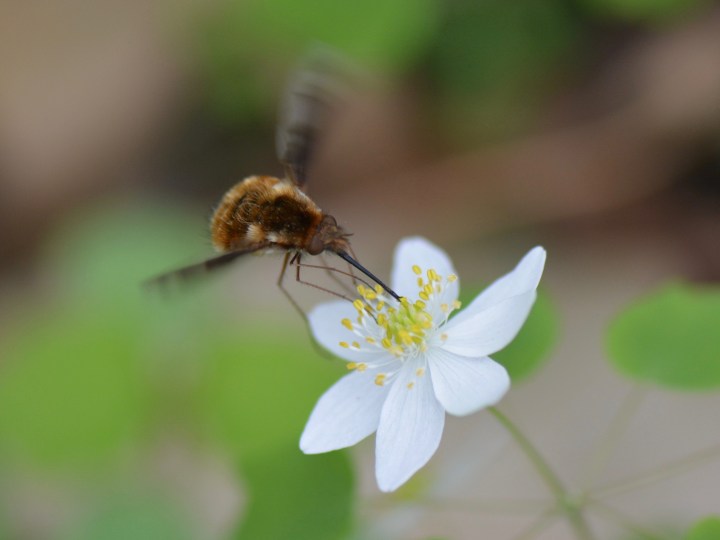 The bee fly is about the size of a small bumble bee, with dense hair, long legs, and a long tongue that lets it hover just above flowers while feeding—staying clear of predators like ambush bugs and spiders. Unlike bees, which land and crawl inside blossoms, bee flies drink while hovering, often visiting early spring wildflowers.