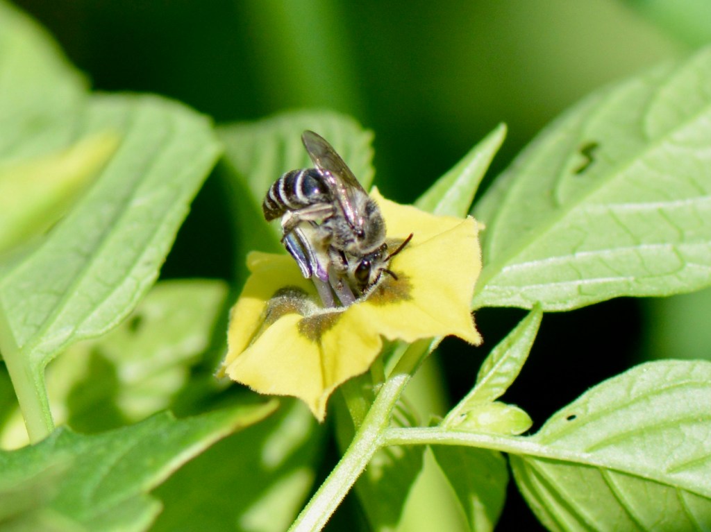 Later in the season, a true specialist makes an appearance: the broad-footed cellophane bee (Colletes latitarsis), which emerges in mid-August. This bee is tightly tied to Physalis species (such as tomatillos and ground cherries), and is what scientists call oligolectic—meaning it gathers pollen from only one plant family. Though these bees prefer Physalis, they have occasionally been spotted supplementing their diet with other flowers blooming nearby.