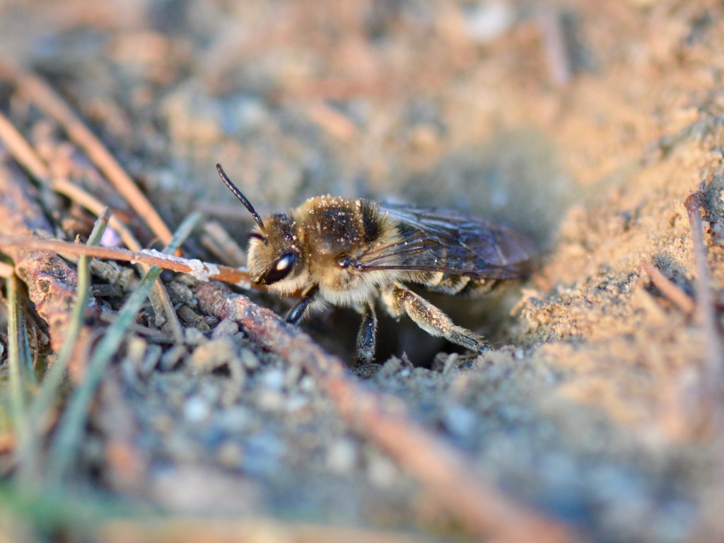 What’s especially fascinating is how these bees live. While they don’t form hives like honey bees, they do nest in large groups—think of it as a bee neighborhood of solitary homeowners. Each female digs and maintains her own tunnel, often right next to dozens or even hundreds of others. She can often be seen at the entrance, guarding her nest. Meanwhile, males—who emerge slightly earlier—cruise low over the ground in search of a mate, returning to their own small burrows at night.