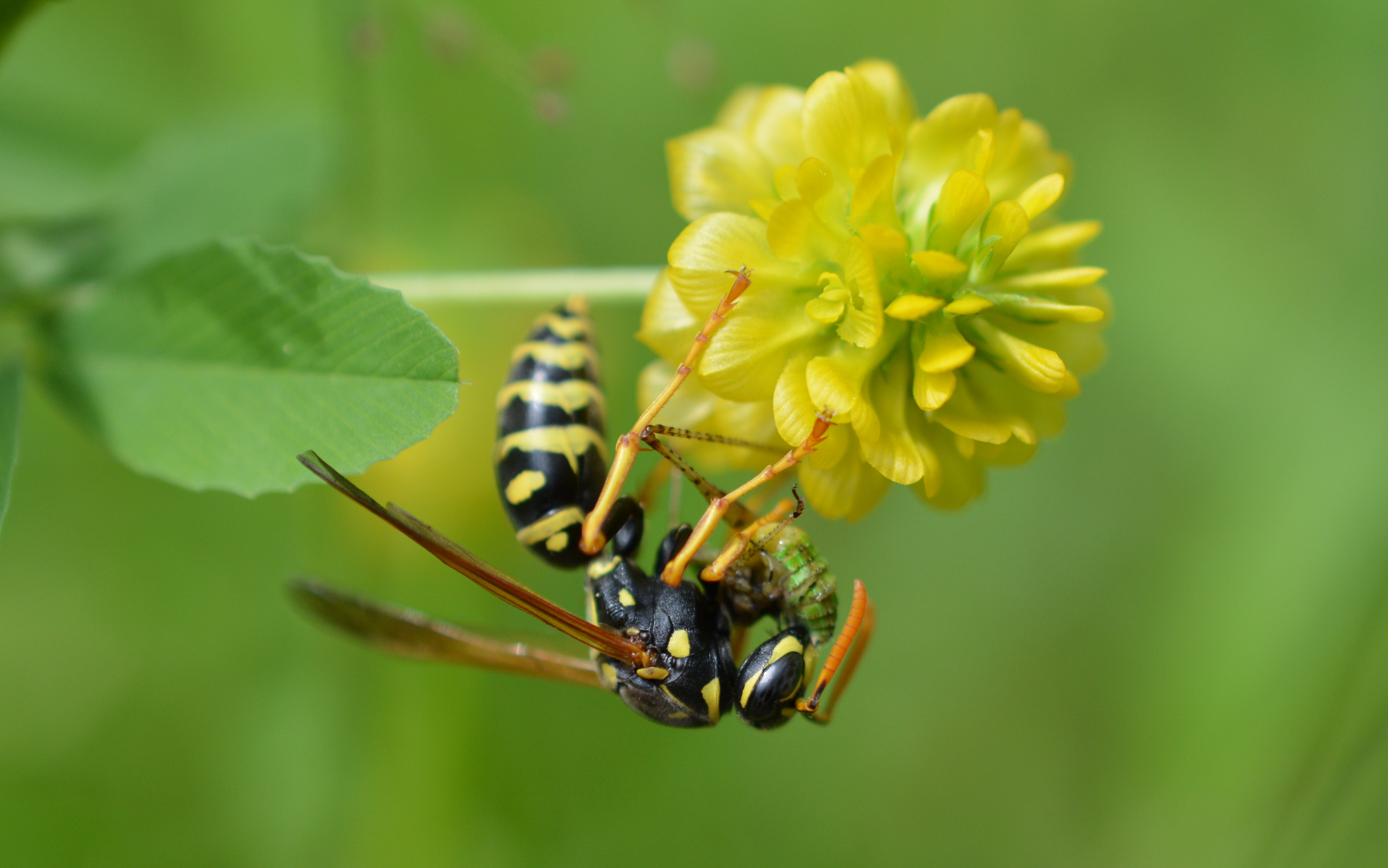 Paper Wasp Eating a Grasshopper on Hop Clover